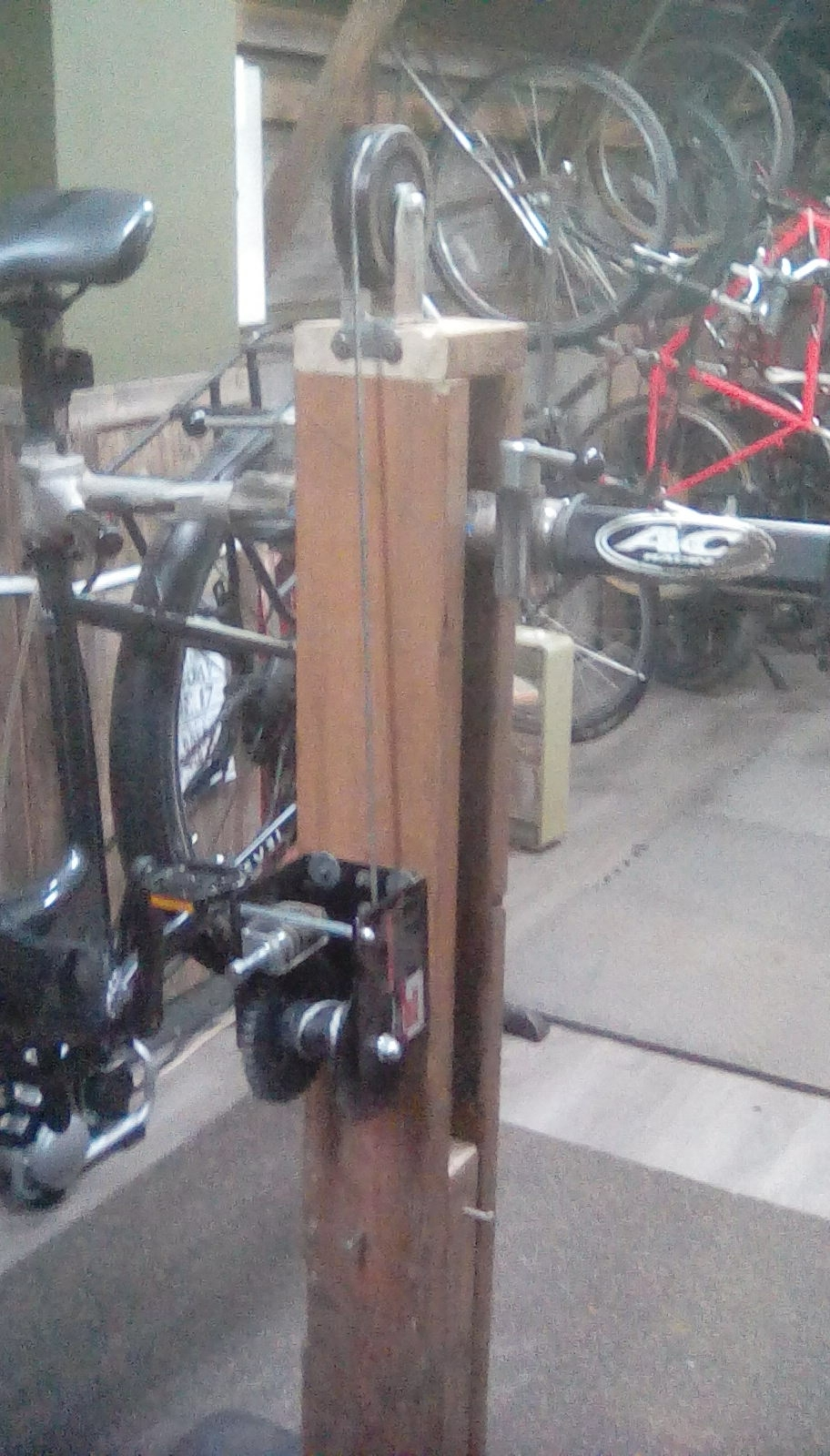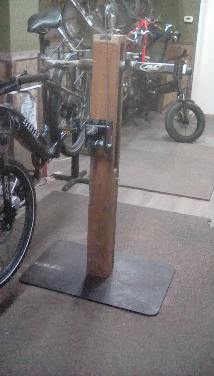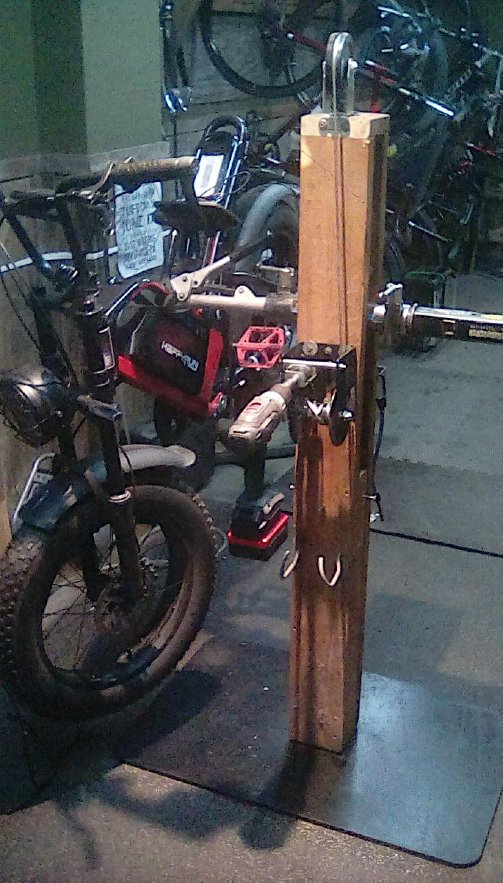 At my new shop, I'm the sole employee, so I had to figure out what I would do to make it possible to repeatedly lift and drop ebikes by myself throughout a given day. Obviously, there are mechanical lifts available from Park Tool and several others, but most cost thousands. Park just recently came out with a smaller model that only cost $500 or so, and another manufacturer I found had a different model in the same price range, but even $500 has been outside my budget thus far. Especially considering I knew I could probably solve the problem on my own somehow.