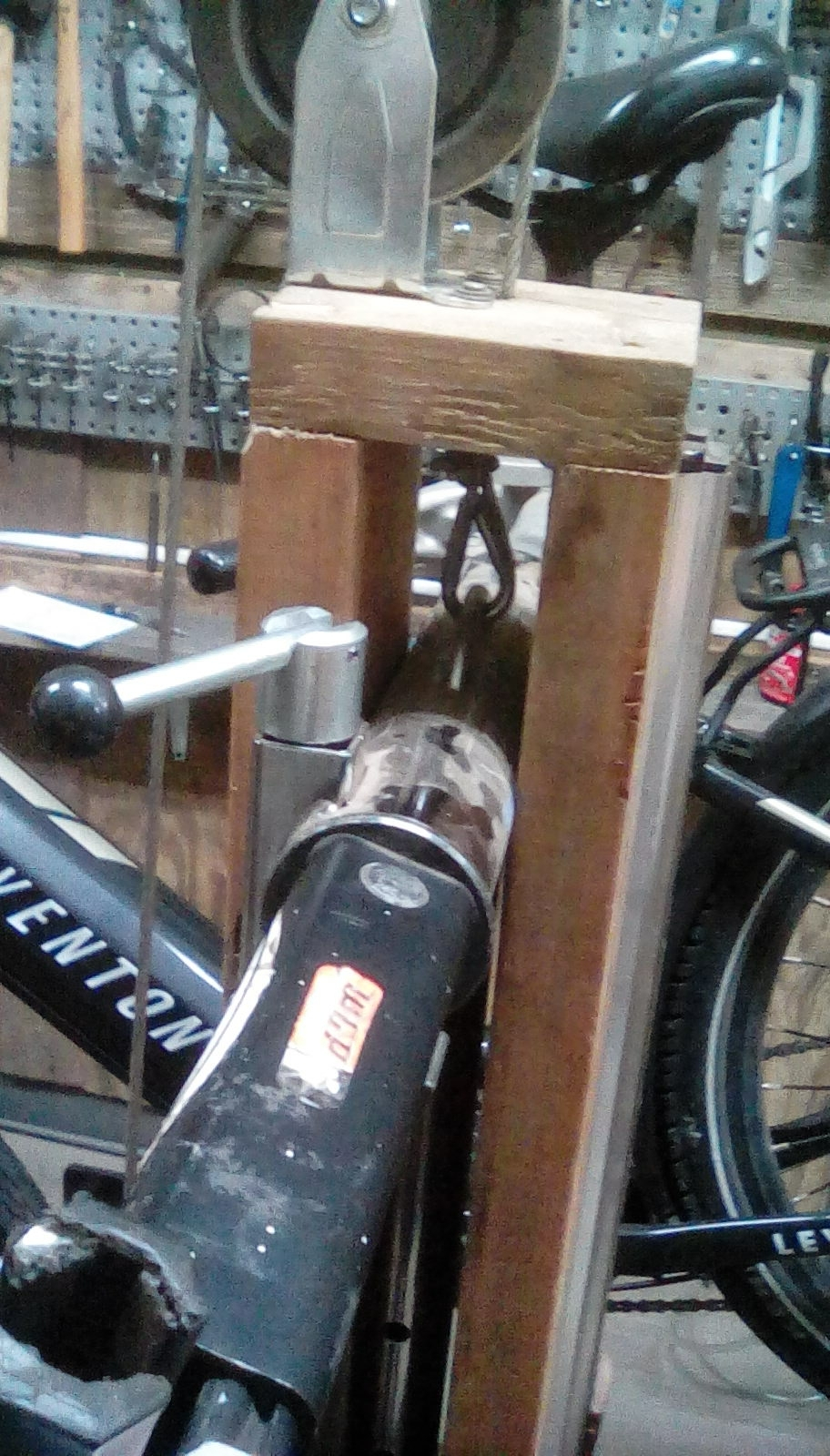 a heavy e-bike onto a stand can pose health and safety issues. Mounting an e-bike in a stand should only be done with proper support and if volunteers and shop users feel able to do so safely.